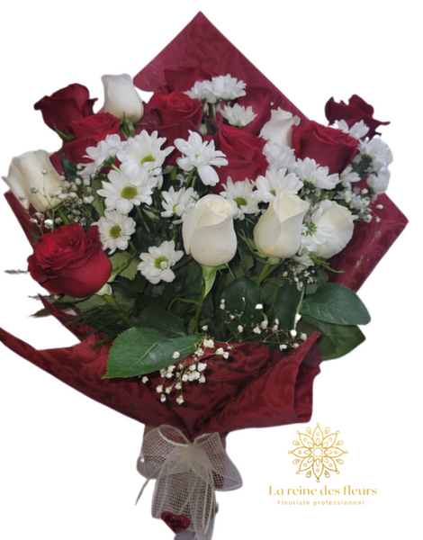 Bouquet de fleurs composé de roses rouges et de fleurs de lys blancs. Pour condoléances, amour, St-Valentin, anniversaire de mariage, couple et autres occasions.
