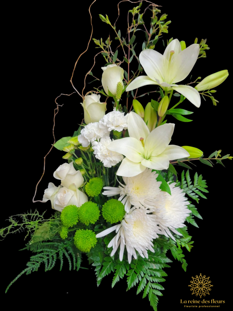 Bouquet élégant et délicat pour condoléances comprenant des lys et des roses blanches, des marguerites vertes, des œillets et des chrysanthèmes.