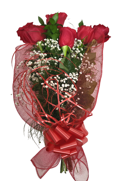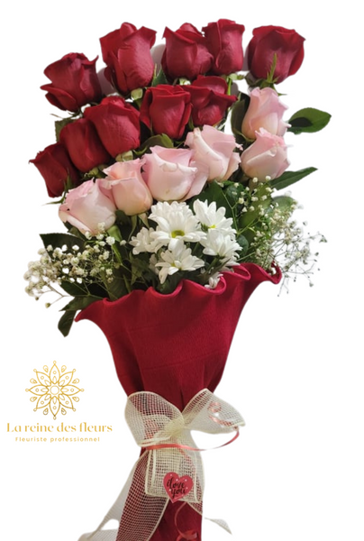 Bouquet composé de roses rouges. Pour amour, St-Valentin, anniversaire de mariage, couple et autres occasions.
