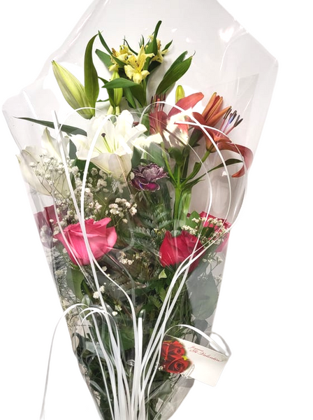 Bouquet de fleurs composé de roses rouges et de fleurs de lys blancs. Pour condoléances, amour, St-Valentin, anniversaire de mariage, couple et autres occasions.
